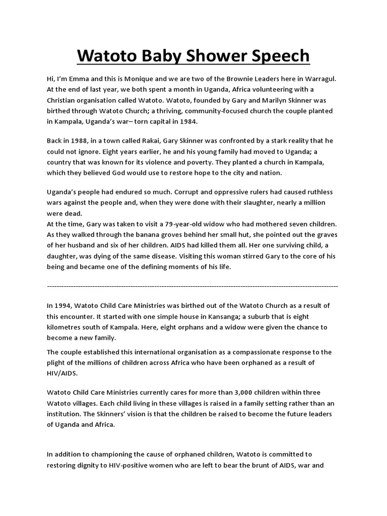 A baby shower speech is a wonderful opportunity to really celebrate the upcoming event. Here are baby shower wishes which can make the mother feel overwhelmed with emotion. Amidst all the advice and the useful gifts, it is delightful to hear your family and friends are behind you, excited and look forward to this life changing event. A baby shower speech is a wonderful opportunity to really celebrate the upcoming event. At the end of last year, we both spent a month in uganda, africa volunteering with a christian organisation called watoto.